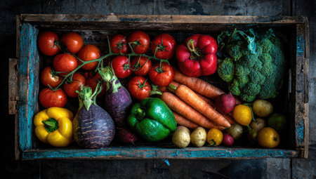 A wooden crate displays various fresh vegetables including tomatoes, carrots, peppers, eggplant, and broccoli. The composition features vibrant colors, with good lighting, and a top-down perspective. This image could be used in various commercial applications related to healthy eating or food-related content, without any specific focus.