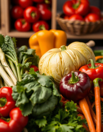 A Fresh vegetables and fruits at farmer market stall, vibrant colors, earthy tones, and natural lighting create warm atmosphere
