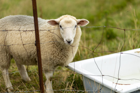 A curious sheep exploring a pasture near a watering trough on a tranquil afternoon in the countryside