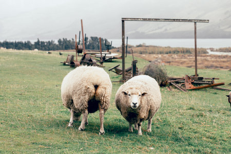 Sheep graze outdoors in New Zealand. Small cattle, animal husbandry.