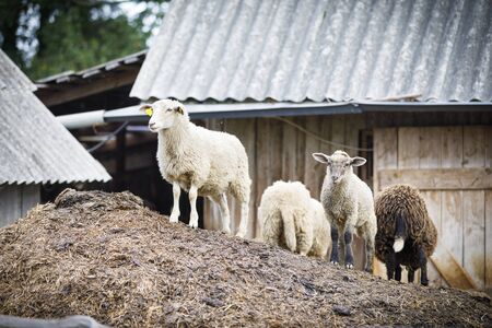 Sheeps on hay and manure in front of barn