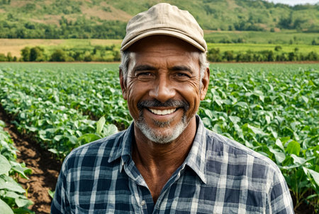 Farmer Smiling Amidst Lush Green Crops, Symbolizing Agricultural Pride