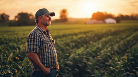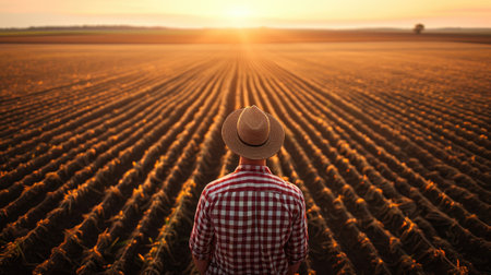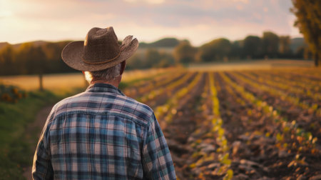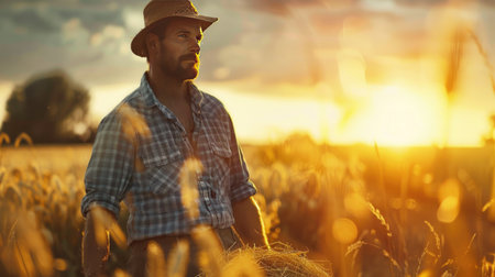 Rugged farmer wearing a hat and overalls standing in a field at sunset, exuding experience and determination
