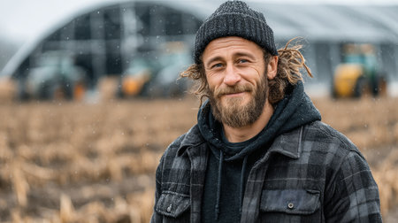 Portrait of a bearded male farmer with arms crossed, wearing a hat, in a rural setting