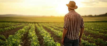 A farmer stands in a lush field gazing at the sunset. Rows of crops stretch into the distance under a golden sky.