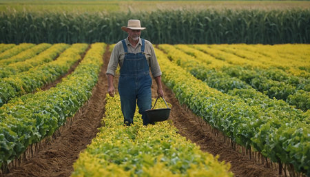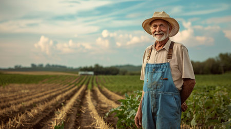 Photo of a farmer in pastel overalls and a straw hat, standing proudly in a field of crops, with plenty of room for copy space, captured with a 35mm lens at f/1.8, --ar 16:9 Job ID: d20657f2-9fd8-4cf6-8ddd-2c4a96b101f8