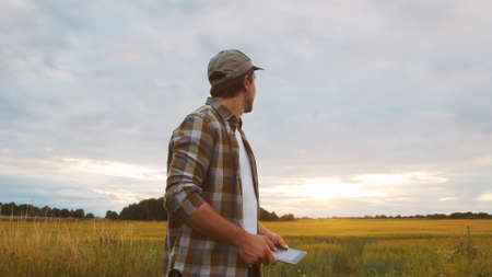 Farmer with a tablet computer in front of a sunset agricultural landscape. Man in a countryside field. Country life, food production, farming and technology.