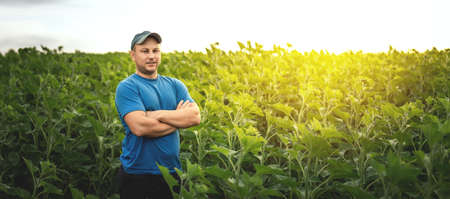 Farmer in soybean field plantation at a beautiful cloudy sunny day