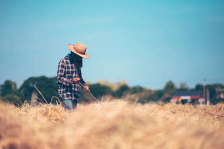 Autumn Farming season. Farmer with harvest on wheat field. Farmer inspecting the harvest. Wheat ready for harvest. Farmer examining harvest. Farmworker walking through the field.