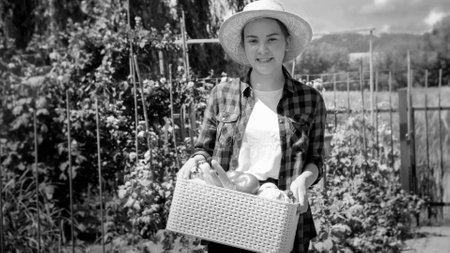 Black and white portrait of smiling female farmer posing with fresh ripe vegetables in box at garden