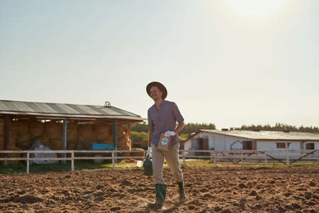 Well-dressed farmers standing on the farmland with green buckets for feeding snails on a farm outdoors. Concept of agribusiness and farming