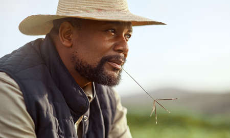 African Farmer with hat stand in the organic plantation field.Agriculture or cultivation concept