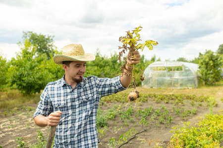Gardening concept a young male gardener taking care of a vegetable by shoveling the soil around the plant.