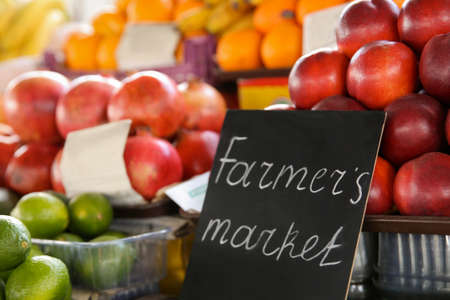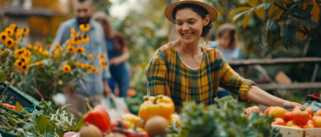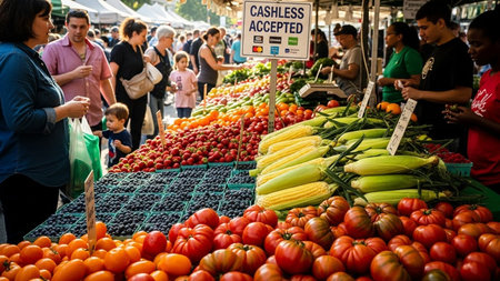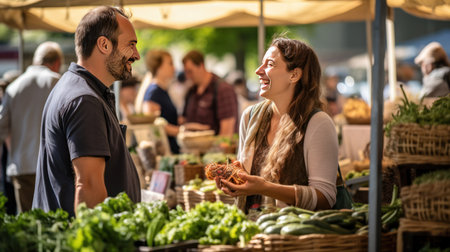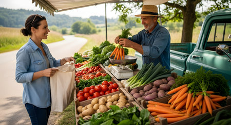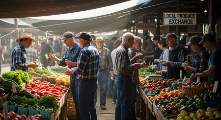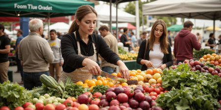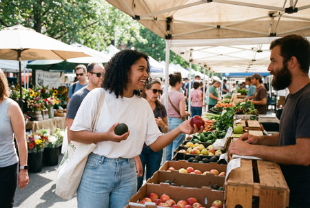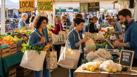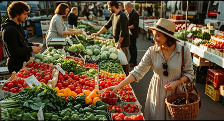 Local farmers market with organic produce, community interaction. Emphasizes support for local agriculture and healthy eating. Background includes market stalls, fresh fruits
