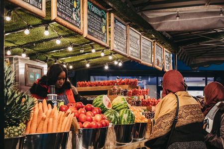 London, UK - March 9, 2019: People buying fruits and fresh juices from Juicebox stall on Oxford Street, London, in the evening. Oxford street is one of the most famous shopping streets in London.