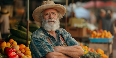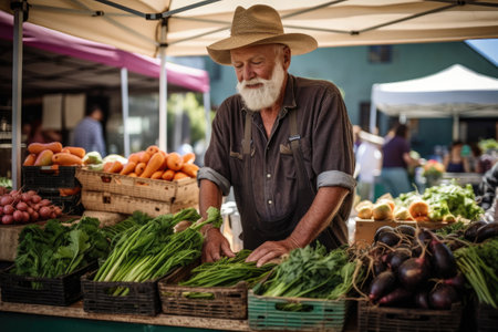 Elderly man selecting vegetables at outdoor farmers market. Candid lifestyle photography. Local produce shopping concept. Design for banner, poster