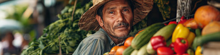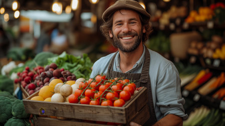 A cheerful man showcases colorful, ripe produce amid a lively outdoor setting, creating a welcoming atmosphere perfect for market themes.