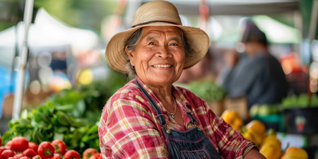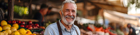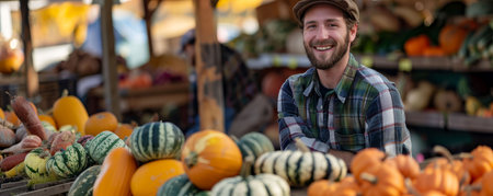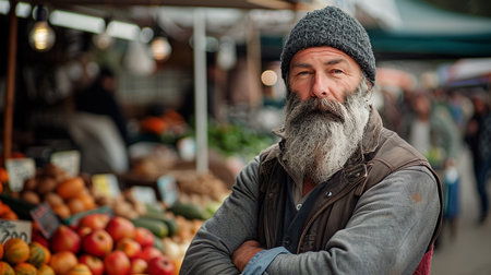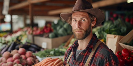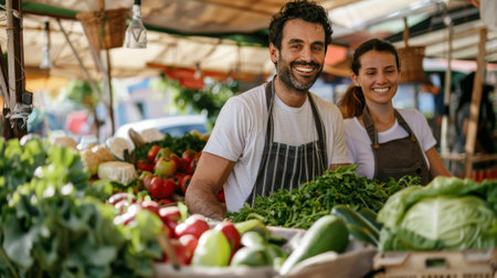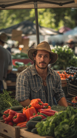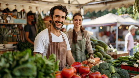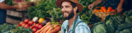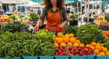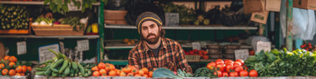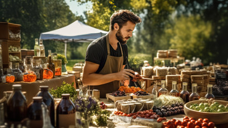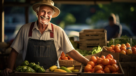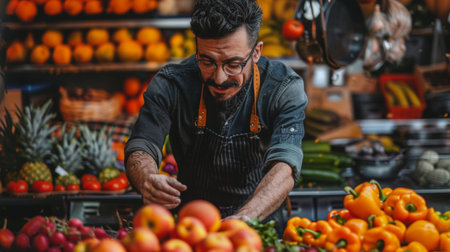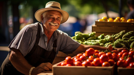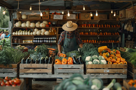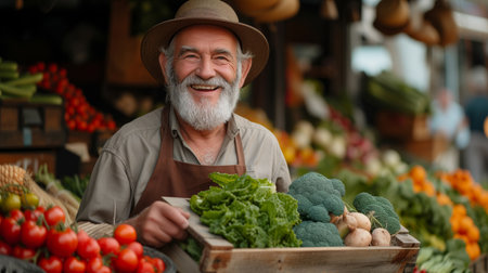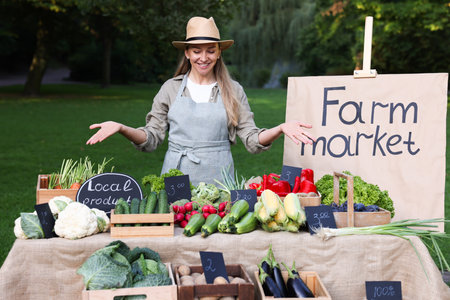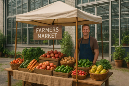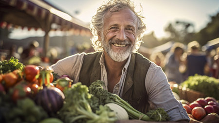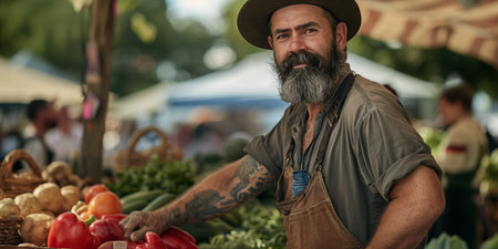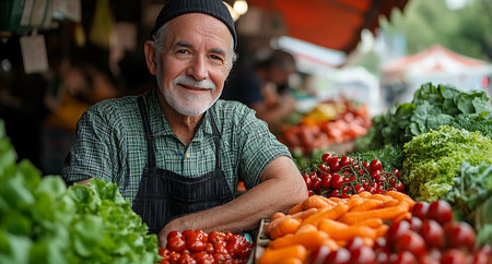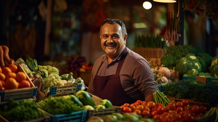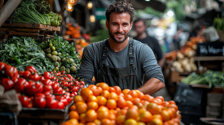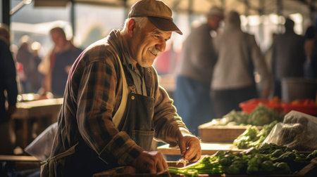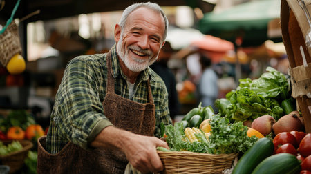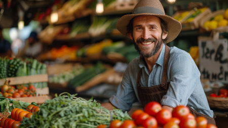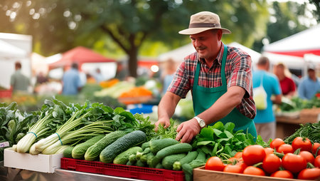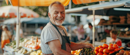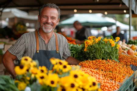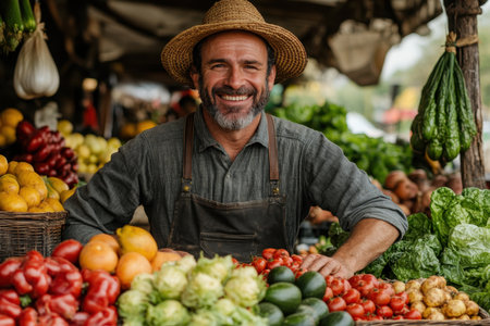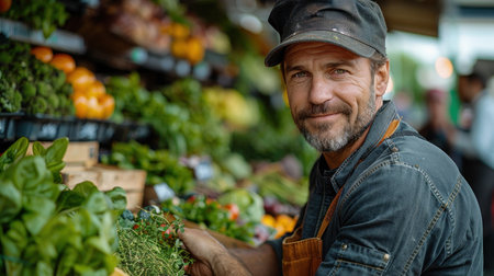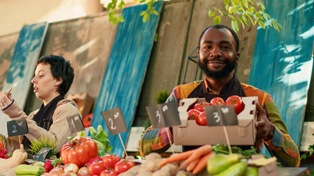 Middle-aged street vendor enthusiastically runs a farm market stall, selling fresh, sustainable produce.
