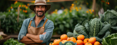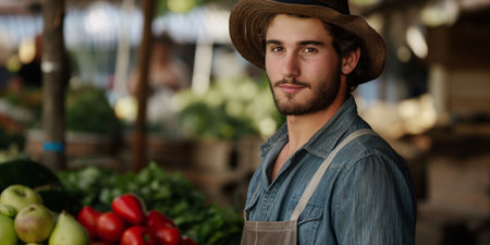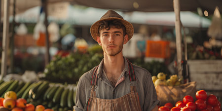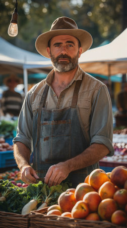 A dedicated farmer stands proudly at an open-air market, surrounded by fresh produce, including vibrant apples and leafy greens, showcasing a connection to nature.