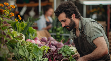 Chef picking out herbs and leafy greens at an urban farmers' market, looking for the freshest ingredients