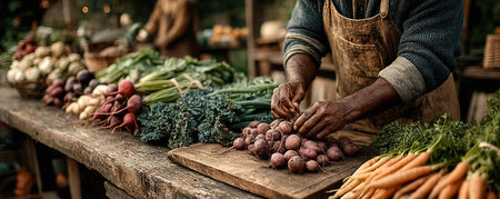 Organic Farmers Market Vendor Arranging Fresh Vegetables at Outdoor Stall