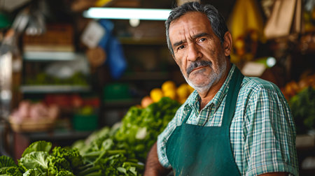 Portrait of a handsome mature man seller standing in front of a vegetable stall.