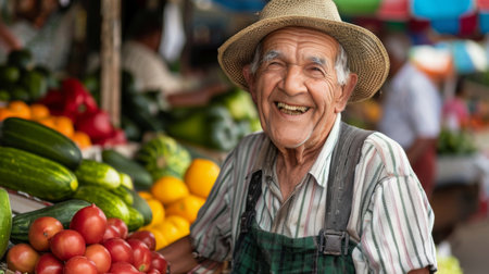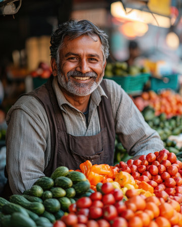 Cheerful Street Vendor Amidst Fresh Organic Bounty