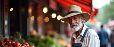 Elderly farmer in denim overalls and straw hat choosing fresh tomatoes at outdoor market. Old man selling vegetables on street. Organic produce, healthy food, local farming and sustainable agriculture