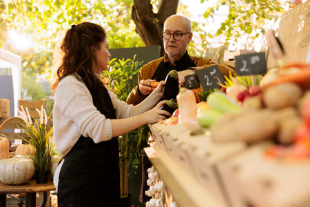 Male local vendor serving woman with various eco products and selling homegrown farm veggies at food market. Female client buying fresh organic fruits and vegetables, healthy nutrition.