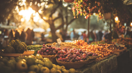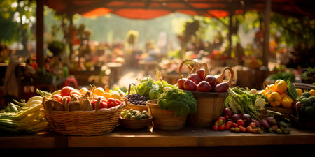 An outdoor market stall displays a variety of fresh produce. Baskets overflow with fruits and vegetables, illuminated by warm sunlight. The scene features a shallow depth of field, with soft colors and a blurred background. Suitable for illustrating themes of food, agriculture, and healthy living. The image offers versatile applications for editorial and commercial projects.