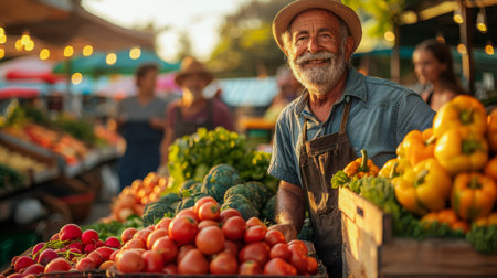Elderly male farmer in straw hat and apron proudly presenting his bountiful harvest at a market table with kale, tomatoes, bell peppers, and other fresh produce on a sunny day.