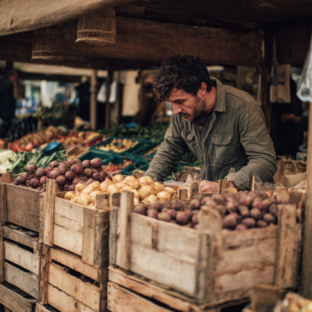 Young man focused on inspecting fresh vegetables at an outdoor market, surrounded by wooden crates filled with colorful produce, creating a lively and inviting atmosphere for shoppers