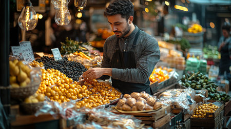 A lively market scene featuring a vendor arranging vibrant fresh produce under warm, glowing lights.