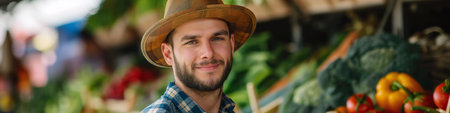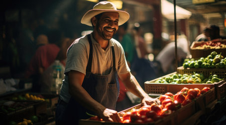 illustration of a smiling male farmer preparing fruits and vegetables for sale at farmers market with Generative AI