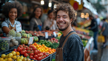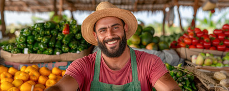 Male vendor at local farmers market offering fruits and vegetables to customers. Generative AI