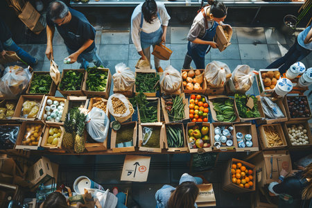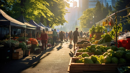 Shoppers browse a variety of fresh fruits and vegetables at a bustling farmers market. The scene is illuminated by natural light, showcasing colorful produce. This image could be used for various commercial purposes, including marketing materials promoting healthy eating habits and sustainable living.