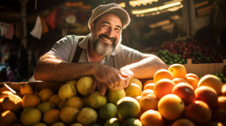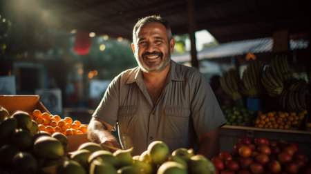A cheerful portrait of a man at a vibrant produce market, surrounded by glowing fresh fruits and vegetables in a lively atmosphere.