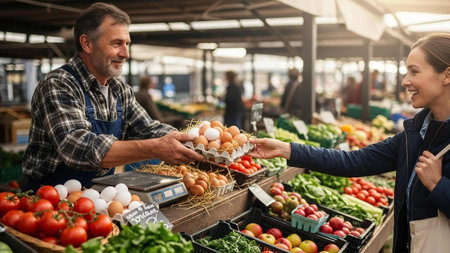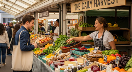 A friendly female vendor smiles as she assists a young male customer at a vibrant farmers' market stall. The stand is abundant with fresh fruits, vegetables, cheeses, and jams, representing local business, healthy eating, and community.
