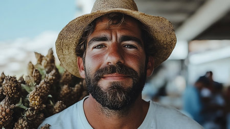 Portrait of a bearded man wearing a straw hat and smiling at the camera