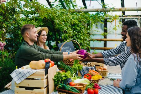 Couple of farmers man and woman are selling cabbage to customers at farm market in greenhouse giving vegetable smiling. Business and shopping concept.
