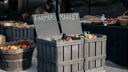 Wooden crates display colorful fruits and vegetables at an outdoor farmers market, inviting shoppers to explore fresh produce in a vibrant and lively setting