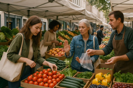 Senior woman refusing plastic bag at a farmers market, choosing to use her reusable tote bag, promoting sustainable shopping habits