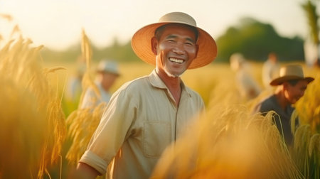 Joyful Farmers Working Together in a Golden Wheat Field During Harvest Season.