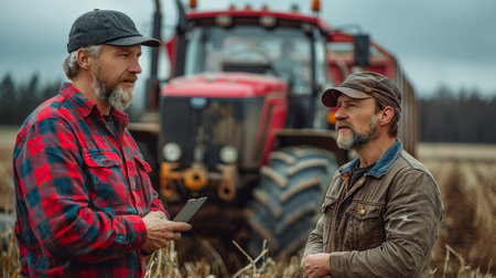 Two mature men, an agronomist and a salesman, engaging in a serious discussion beside a modern tractor in a rural farmland setting.