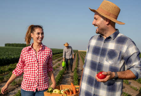 Young female farmer laughing carrying wodden crate together with handsome man holding tomato. Senior farmer using watering can to water plants behind.