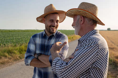 Young and elderly farmers standing on road next to field with crossed arms. Two men wearing plaid shirts and straw hats talking laughing.