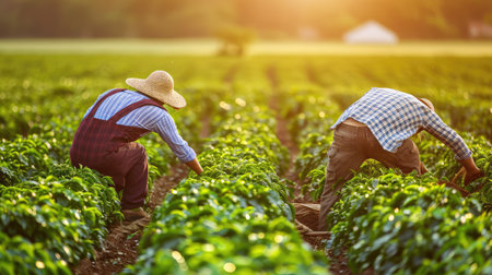 Two farmers manually irrigate their crops on a sunny day. The image shows the hard work and dedication of these people.