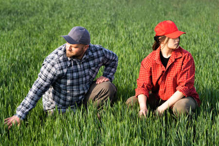 Young farmers examing planted young wheat in spring