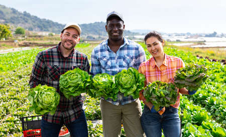 Three positive multiethnic gardeners with lettuce crop