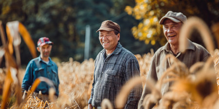 Four farmers standing in a golden wheat field, viewed from behind, under a clear sky